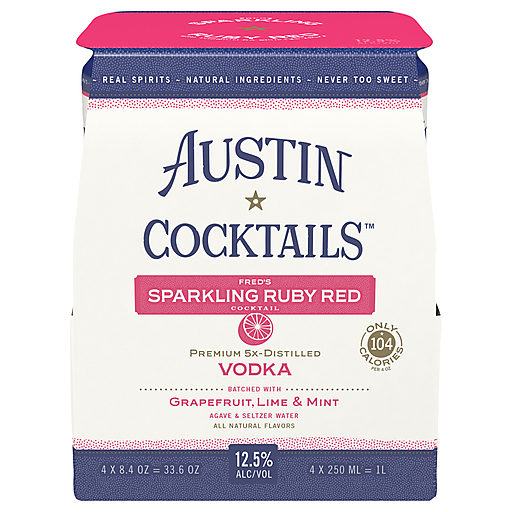 Austin Cocktails Fred's Sparkling Ruby Red Vodka Canned Cocktail is a pre-batched artisanal mixed drink with a light and refreshing grapefruit flavor. This vodka cocktail is an ode to Grandpa Fred, a down-to-earth farmer with a contagious, effervescent charm, and the grandfather of Austin Cocktails' founders, Kelly and Jill. Made in small batches with quality ingredients, including 5x-distilled vodka; ruby red grapefruit; juicy lime; crisp mint; organic agave nectar; and a splash of seltzer, this gluten-free craft cocktail has a never-too-sweet, refreshingly tart, complex flavor with a sparkling twist. With these ready made mixed drinks' convenience and on-the-go portability, Austin Cocktails canned vodka drinks are sure to be a big hit at backyard BBQs, cocktail parties, or poolside gatherings! Each 250 mL can in this mixed drink 4 pack pours two 4-oz* vodka cocktails at 12.5% alcohol by volume. For best taste of this canned seltzer cocktail, serve well-chilled or poured over ice in your favorite cocktail glasses. Like the city that inspired them, Austin Cocktails are creative, authentic, and full of natural flavor. *Per 1.5 fl. oz. serving of average analysis: Calories 39, Carbs 2.5 grams, Protein 0 grams, Fat 0 grams. Drink Responsibly. Austin Cocktails™ Fred’s Ruby Red Cocktail, Vodka with natural flavors and colored with vegetable juice, 12.5% alc/vol. © 2025 Austin Cocktails, Austin, TX