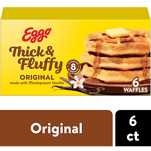 Wake up and greet the day with the feel-good taste of Eggo Thick and Fluffy Original waffles. Crafted with delicious ingredients, our waffles are a perfect balance of crispy, fluffy goodness. Convenient and easy to prepare, Eggo Thick and Fluffy Original waffles made with Madagascar vanilla bring warmth to busy mornings. With no artificial colors and flavors, our waffles also provide a good source of 8 vitamins and minerals; Great for families and individuals, these rich waffles are made to enjoy as a stand-alone breakfast treat. Try them with your favorite morning toppings like butter and syrup, jellies and preserves, and whipped cream. Thinking of taking a turn for the savory? Go ahead and try them with fried chicken, bacon, or sausage, or combine for a delicious waffle sandwich. The scrumptious possibilities are endless! They're so delicious you just can't L'Eggo!