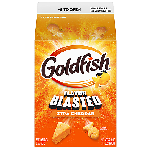 Kick snack time up a notch with the intense flavor of Pepperidge Farm Goldfish Flavor Blasted Xtra Cheddar Cheese Crackers, the fun, fish-shaped snack crackers with a smile. Packed with extra cheesy flavor, these baked cheese snacks are made with ingredients you can feel good about, including real Cheddar cheese and no artificial flavors or preservatives. The fun, bite-sized shape of these extra cheddar Goldfish crackers makes them the perfect at-home or on-the-go snacks for kids and adults. Crunchy and cheesy with a big, bold flavor, they’re a munchable must-have for school lunches, study sessions, road trips, movie nights and more. Make meals more exciting by serving Flavor Blasted Goldfish Xtra Cheddar Crackers with a sandwich and fruit as part of a balanced lunch, or try them as soup crackers or salad croutons for dinner. You can even crumble them up and use them to bread chicken breasts for a cheesy twist on a classic. Each satisfying serving of 51 Flavor Blasted Goldfish contains 140 calories and 5 grams of fat. This 27.3-ounce carton contains roughly 25 servings and is the ideal size for stocking your pantry. Goldfish snack crackers are also available in other cheesy flavors, including Cheddar Jack’d and Cheesy Pizza. Go for the handful with Goldfish.