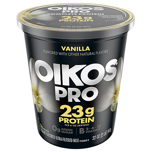 Go big on protein with Oikos Pro Vanilla Yogurt-Cultured Ultra-Filtered Milk Product. Each 6 oz serving from this Oikos Pro Vanilla tub packs a punch with 23g protein to help support strong muscles,* 50% more protein than average Greek yogurt.** Plus, every serving contains complete protein (all nine essential amino acids) and is a good source of vitamin D and calcium for strong bones. This thick and creamy snack contains 0g added sugar*** per serving, and no artificial flavors or colors from artificial sources. Oikos Pro is a high protein snack that is lower in lactose than traditional yogurt products. With protein and deliciousness, Oikos Pro is a great tasting, convenient solution for adding complete protein to your diet every day, making it a great choice for busy professionals, students and athletes looking for post workout snacks. Pack Oikos Pro with fresh fruit or your favorite toppings in a to-go container with an ice pack in your lunchbox for school or the office. Enjoy this high protein snack for an afternoon pick-me-up or use as an addition to protein shakes and smoothies. Experience the power of complete protein with Oikos Pro Vanilla Yogurt-Cultured Ultra-Filtered Milk. Oikos Pro — Stronger Makes Everything Better(R). *Protein and exercise help fuel strong muscles as part of a balanced diet. **Oikos Pro:23-25g protein (46-50%DV) per 6 oz serving; Average Greek yogurt: 14g protein (28% DV) per 6 oz serving ***Not a low-calorie food.