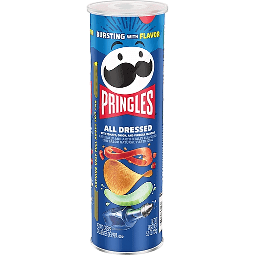 What comes next after the “pop” of a Pringles can? The crisp, crunchy, hit-the-spot taste of potato seasoned with the classic All Dressed seasonings and flavors. Ingeniously shaped Pringles All Dressed potato crisps chips are insanely light, crispy, and never greasy. Perfect for sharing, these crisps are bursting with tangy, sweet, and savory flavor featuring onion, garlic, vinegar and a blend of spices; With this convenient, portable can, it’s easy to create your own snacking moments wherever and whenever. Grab a can as a pick-me-up for after school or pack as the ultimate car snack for road trips. Bring these snacks to game time and pack a few for other Pringles fans. Stash this anytime snack in your work desk or pantry to enjoy anytime. Share Pringles at your next cookout or BBQ to turn up the flavor and fun among family and friends. Get your hands on Pringles All Dressed potato crisps chips for an irresistible taste experience that keeps you coming back, stack after stack.