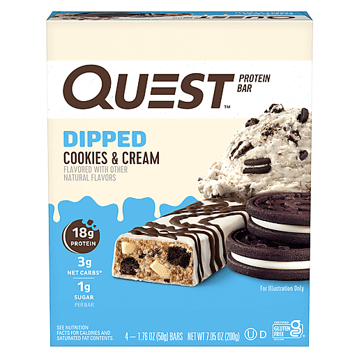Quest™ Dipped Cookies & Cream Protein Bars. You’re favorite Quest protein bars! Try them Dipped! Enjoy the delicious taste of classic cookies & cream protein bar dipped and drizzled with a sweet chocolatey coating. Try the protein bars with 18g of protein and 3g of net carbs*, and dipped in chocolatey goodness.